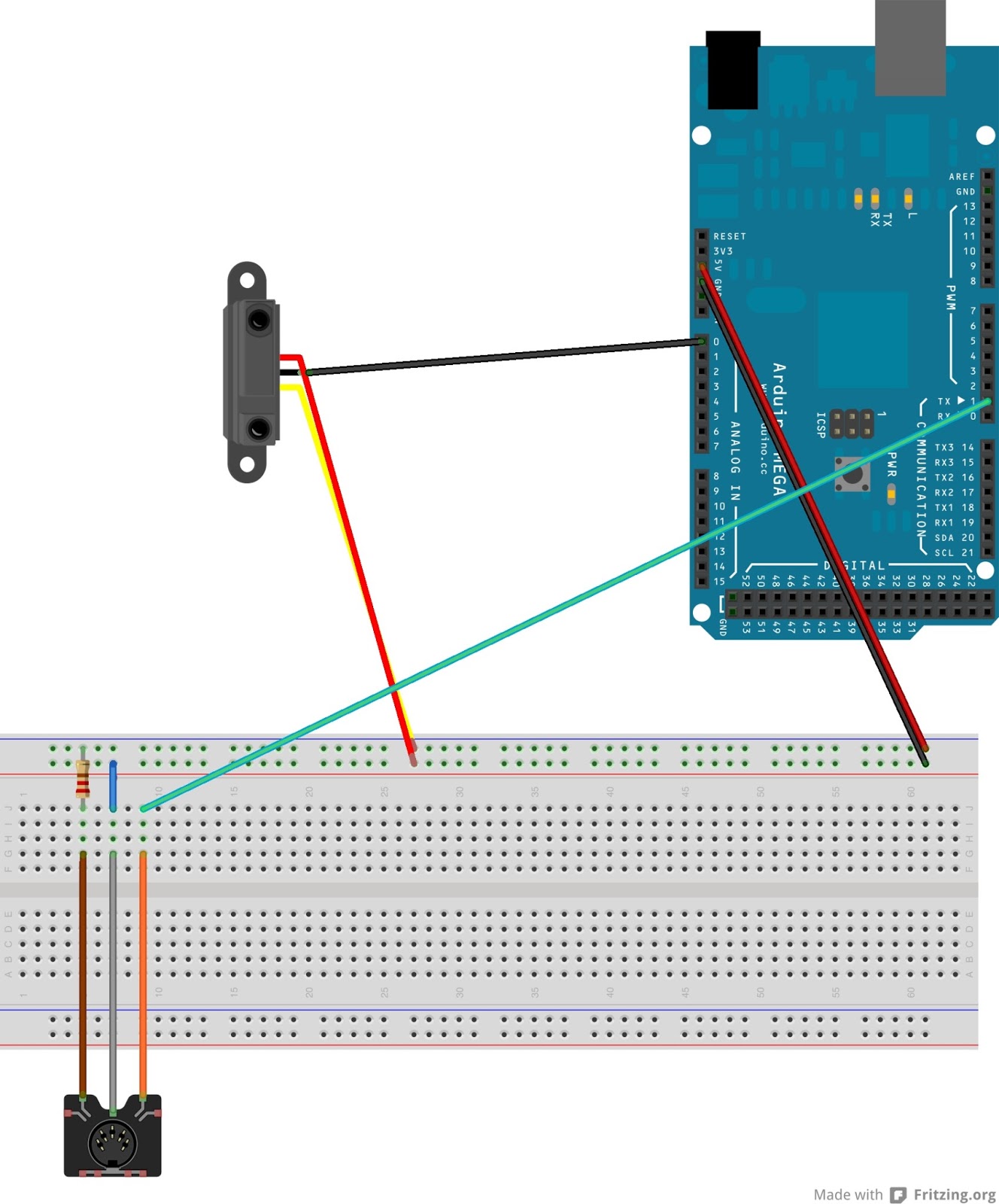 The piezos were connected to analog inputs 0-4, a 1M Ohm resistor was wired in parallel with the piezos to function as a pull down resistor.